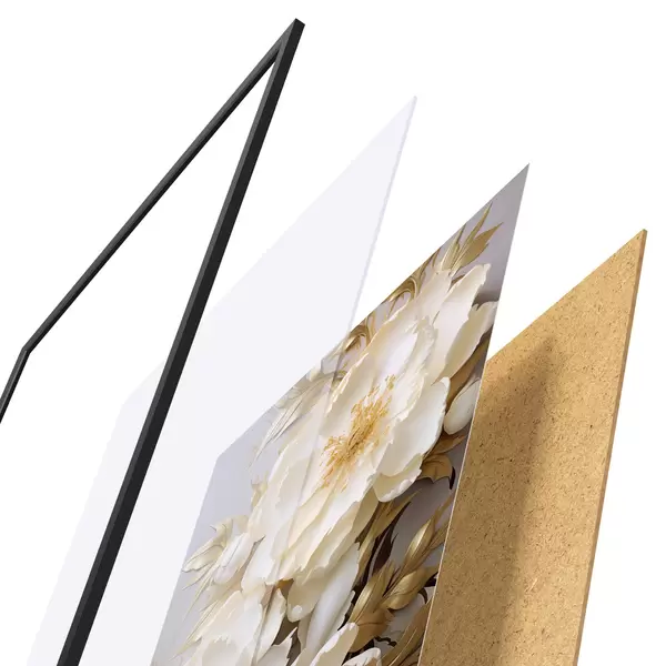 El póster consta de marco, plexiglás, imagen impresa y soporte de aglomerado. El póster puede colgarse inmediatamente en la pared gracias a los soportes de la parte posterior.
