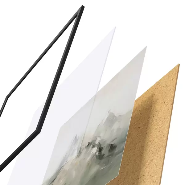 El póster consta de marco, plexiglás, imagen impresa y soporte de aglomerado. El póster puede colgarse inmediatamente en la pared gracias a los soportes de la parte posterior.