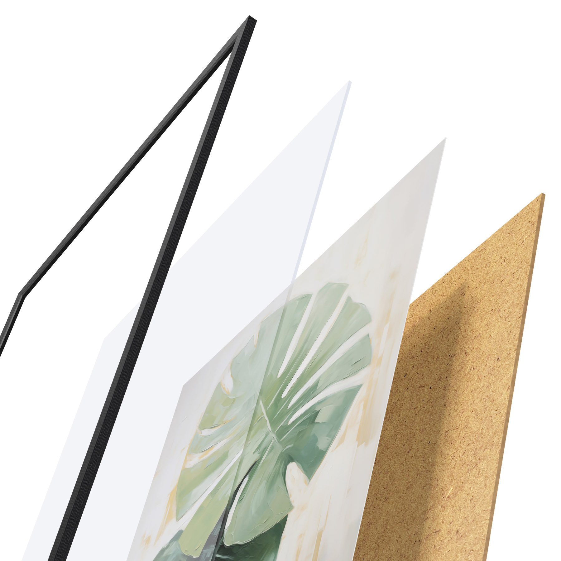 El póster consta de marco, plexiglás, imagen impresa y soporte de aglomerado. El póster puede colgarse inmediatamente en la pared gracias a los soportes de la parte posterior.