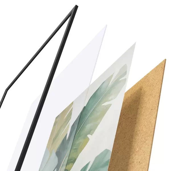 El póster consta de marco, plexiglás, imagen impresa y soporte de aglomerado. El póster puede colgarse inmediatamente en la pared gracias a los soportes de la parte posterior.