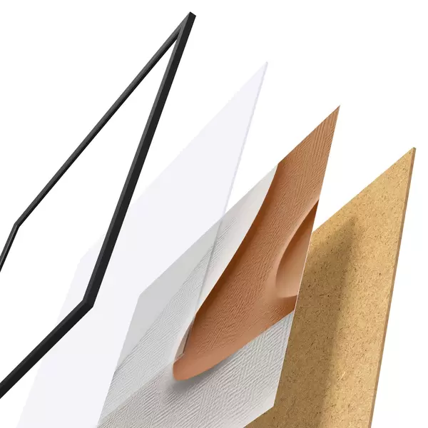 El póster consta de marco, plexiglás, imagen impresa y soporte de aglomerado. El póster puede colgarse inmediatamente en la pared gracias a los soportes de la parte posterior.