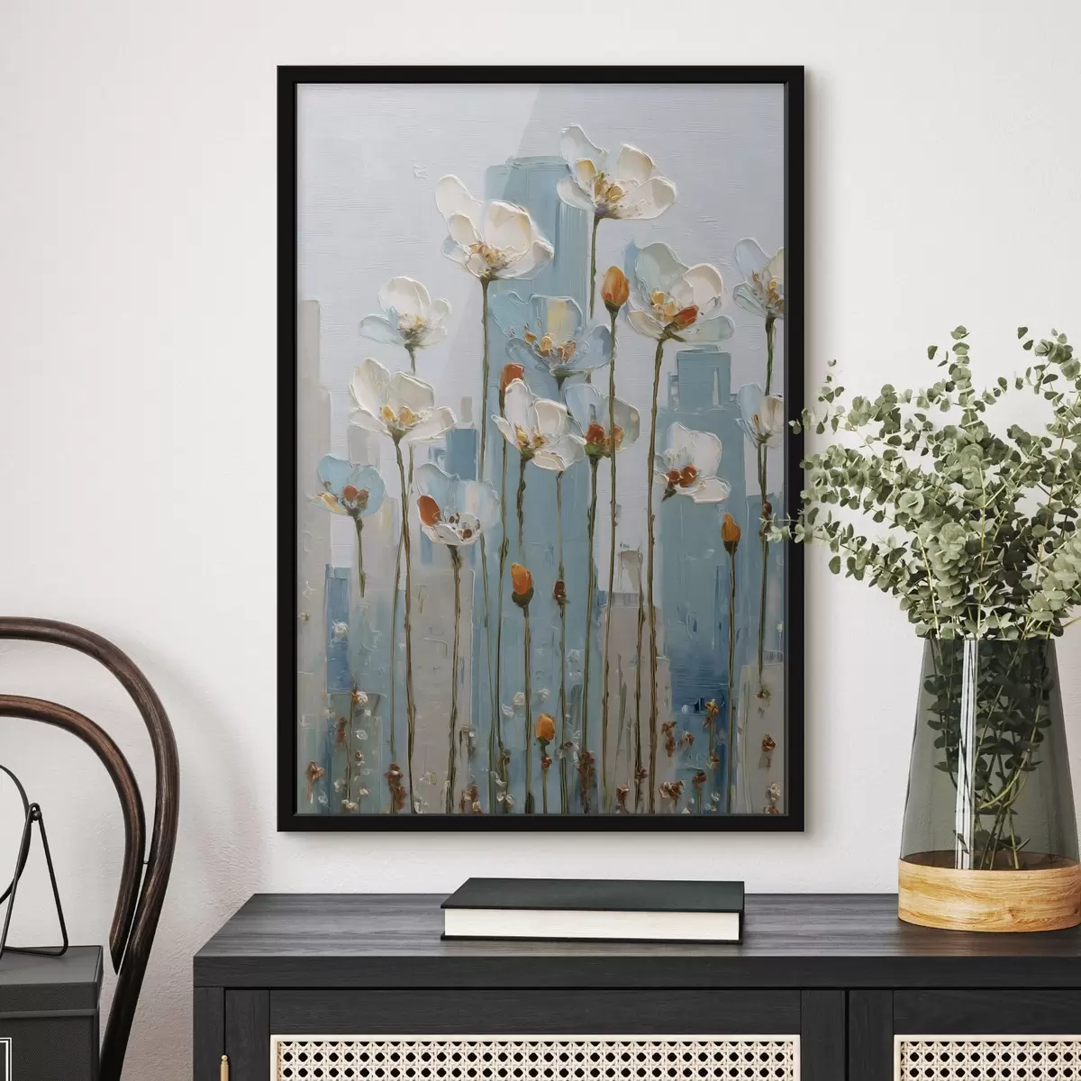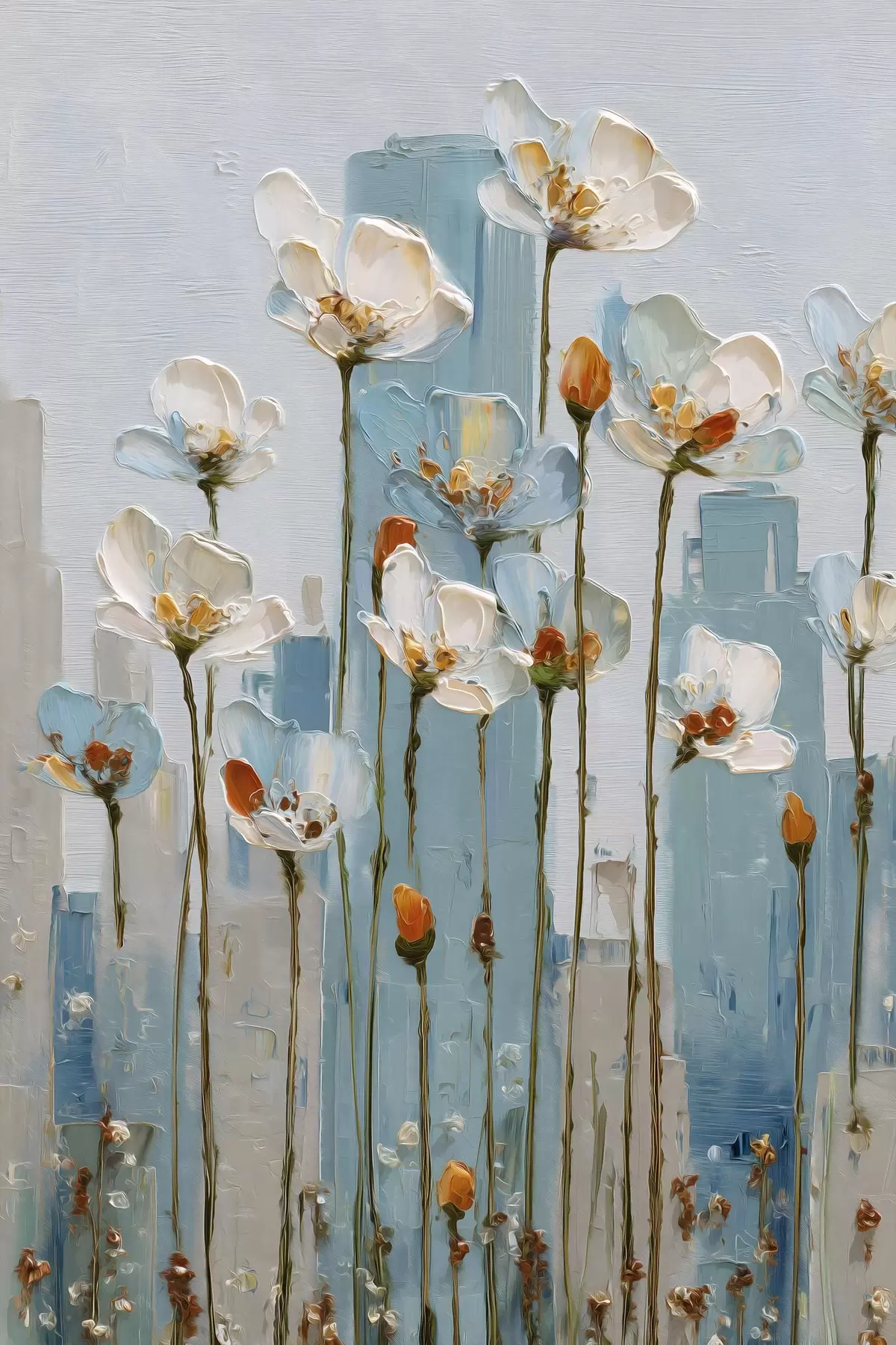 Poster flores con la ciudad de fondo, al estilo de una pintura al óleo Nr f48785