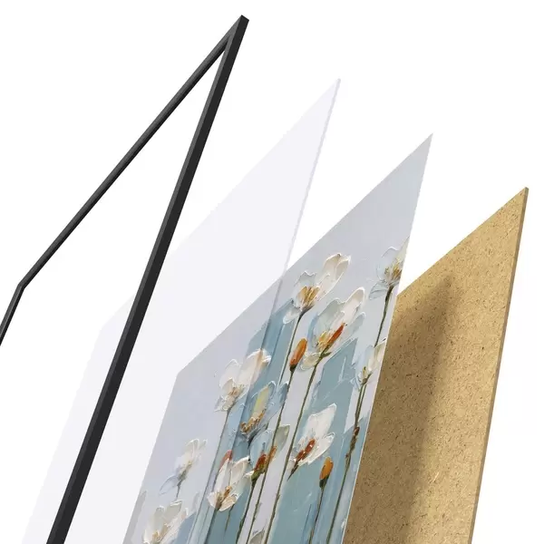 El póster consta de marco, plexiglás, imagen impresa y soporte de aglomerado. El póster puede colgarse inmediatamente en la pared gracias a los soportes de la parte posterior.