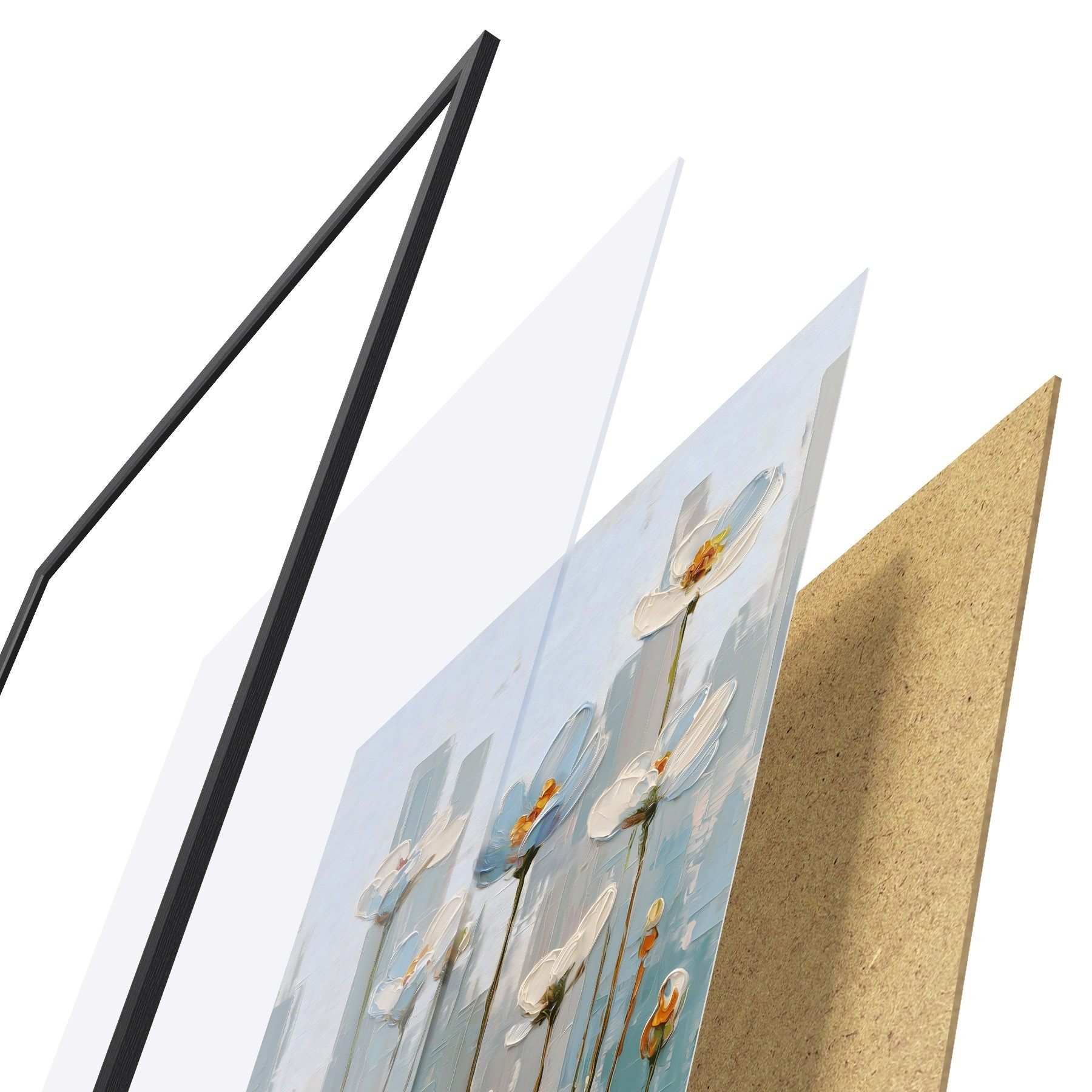 El póster consta de marco, plexiglás, imagen impresa y soporte de aglomerado. El póster puede colgarse inmediatamente en la pared gracias a los soportes de la parte posterior.