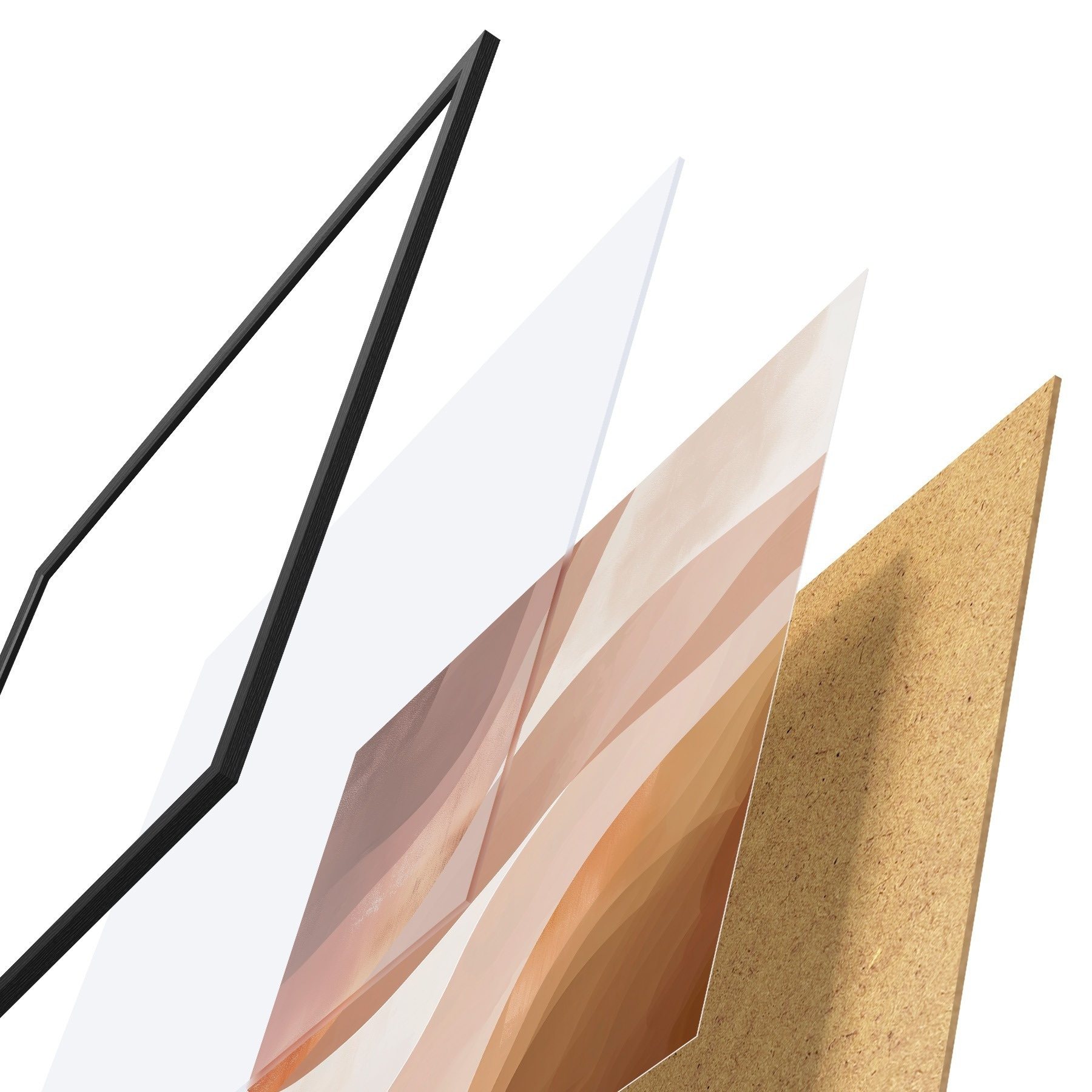 El póster consta de marco, plexiglás, imagen impresa y soporte de aglomerado. El póster puede colgarse inmediatamente en la pared gracias a los soportes de la parte posterior.