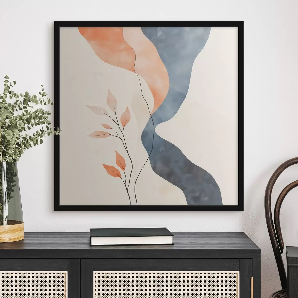 Poster Composición floral con líneas fluidas en una paleta de colores azul y naranja f48837