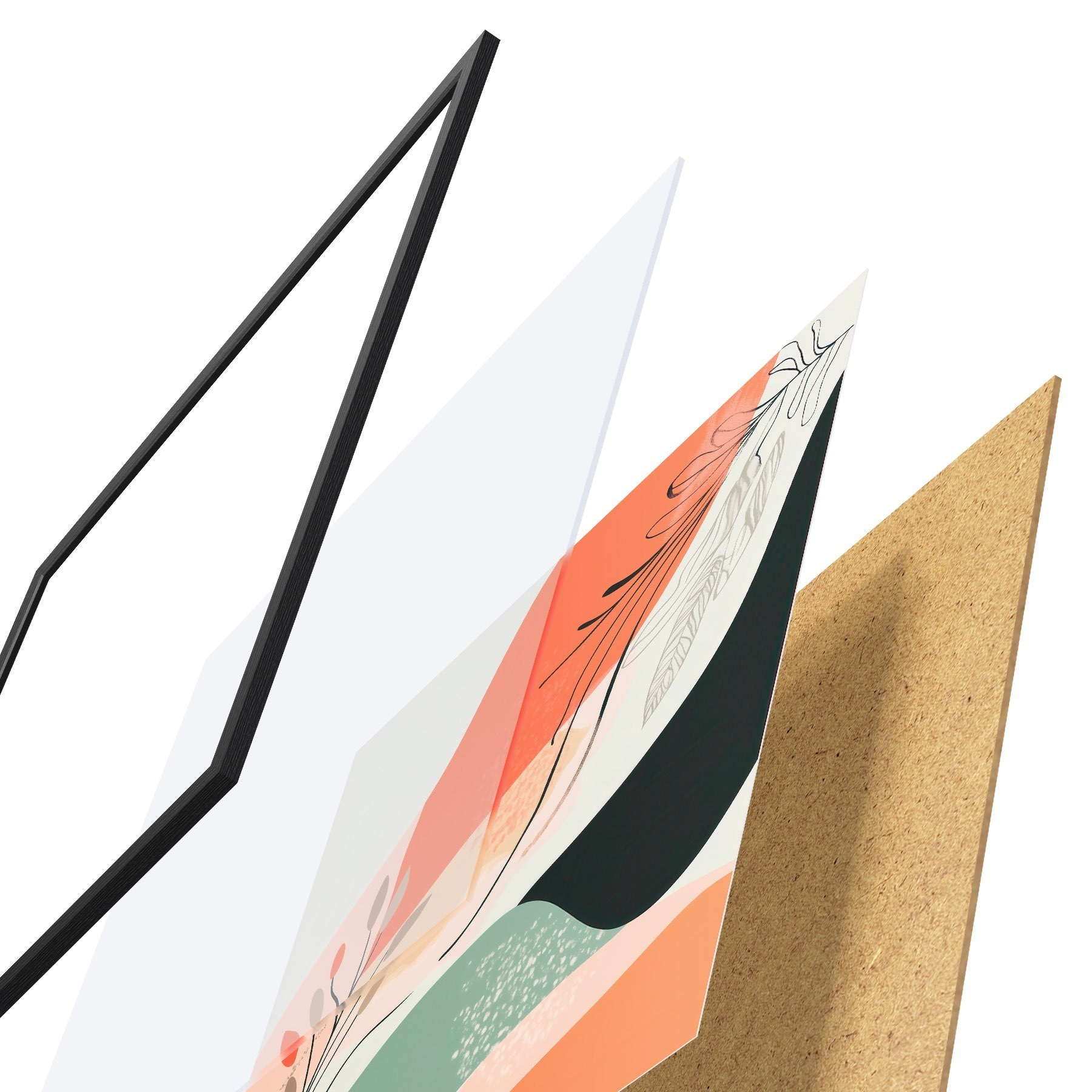 El póster consta de marco, plexiglás, imagen impresa y soporte de aglomerado. El póster puede colgarse inmediatamente en la pared gracias a los soportes de la parte posterior.