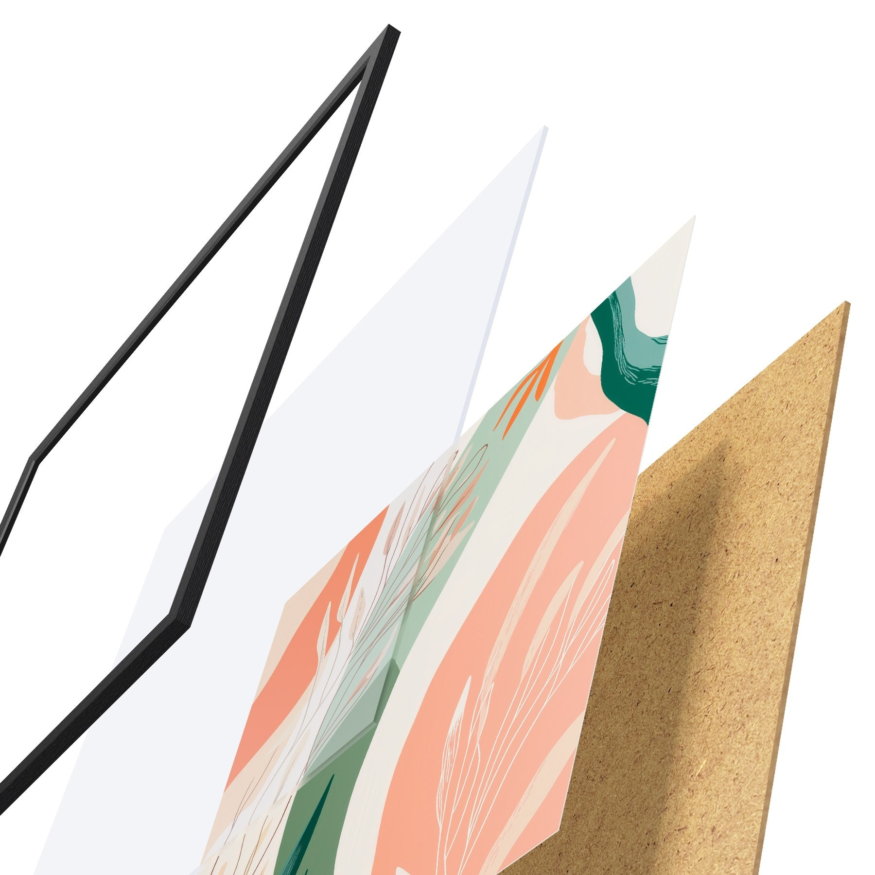El póster consta de marco, plexiglás, imagen impresa y soporte de aglomerado. El póster puede colgarse inmediatamente en la pared gracias a los soportes de la parte posterior.