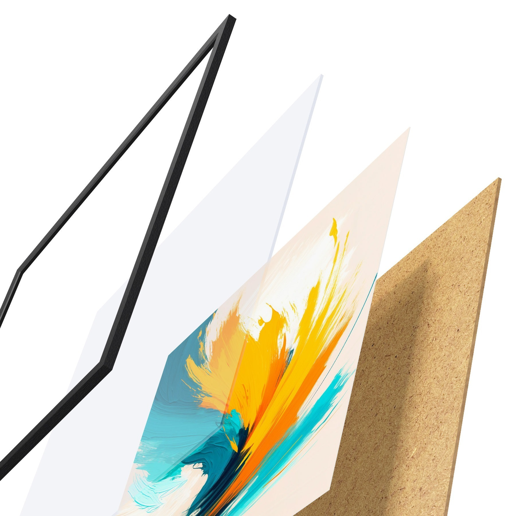 El póster consta de marco, plexiglás, imagen impresa y soporte de aglomerado. El póster puede colgarse inmediatamente en la pared gracias a los soportes de la parte posterior.