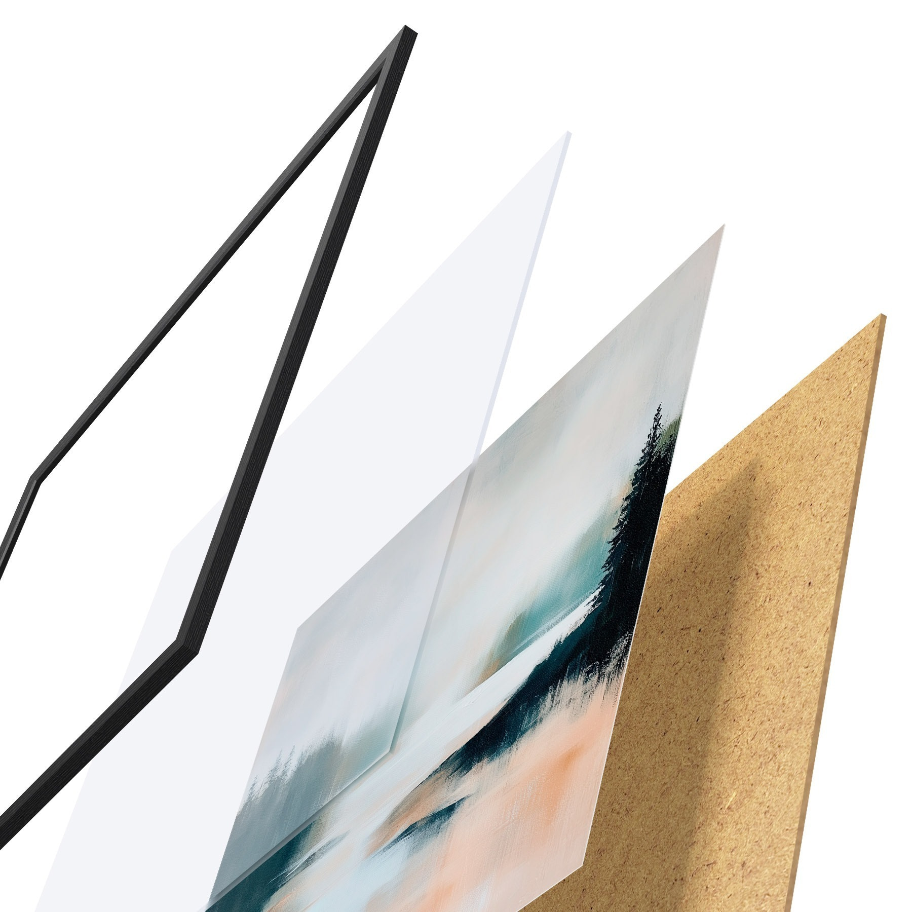 El póster consta de marco, plexiglás, imagen impresa y soporte de aglomerado. El póster puede colgarse inmediatamente en la pared gracias a los soportes de la parte posterior.
