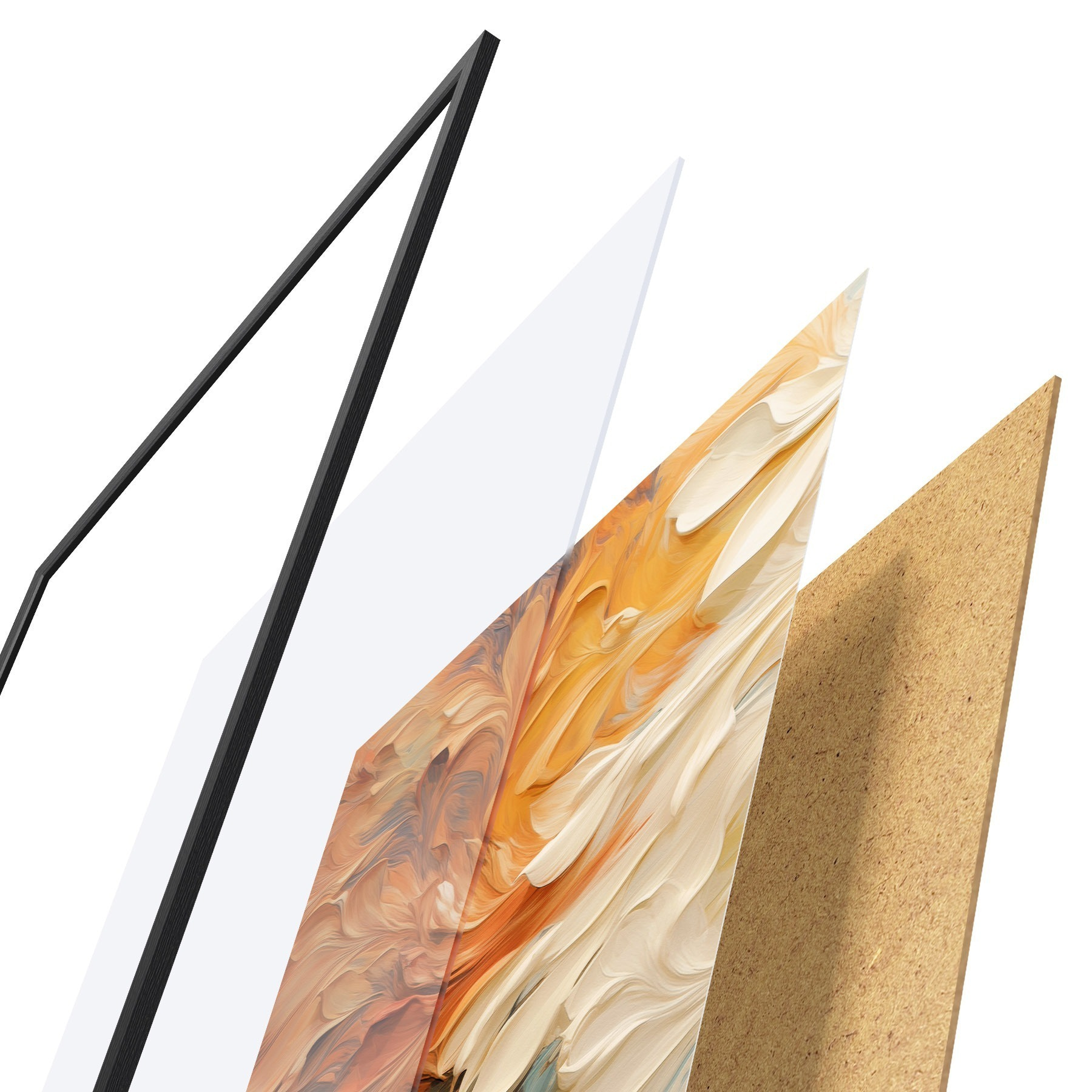 El póster consta de marco, plexiglás, imagen impresa y soporte de aglomerado. El póster puede colgarse inmediatamente en la pared gracias a los soportes de la parte posterior.