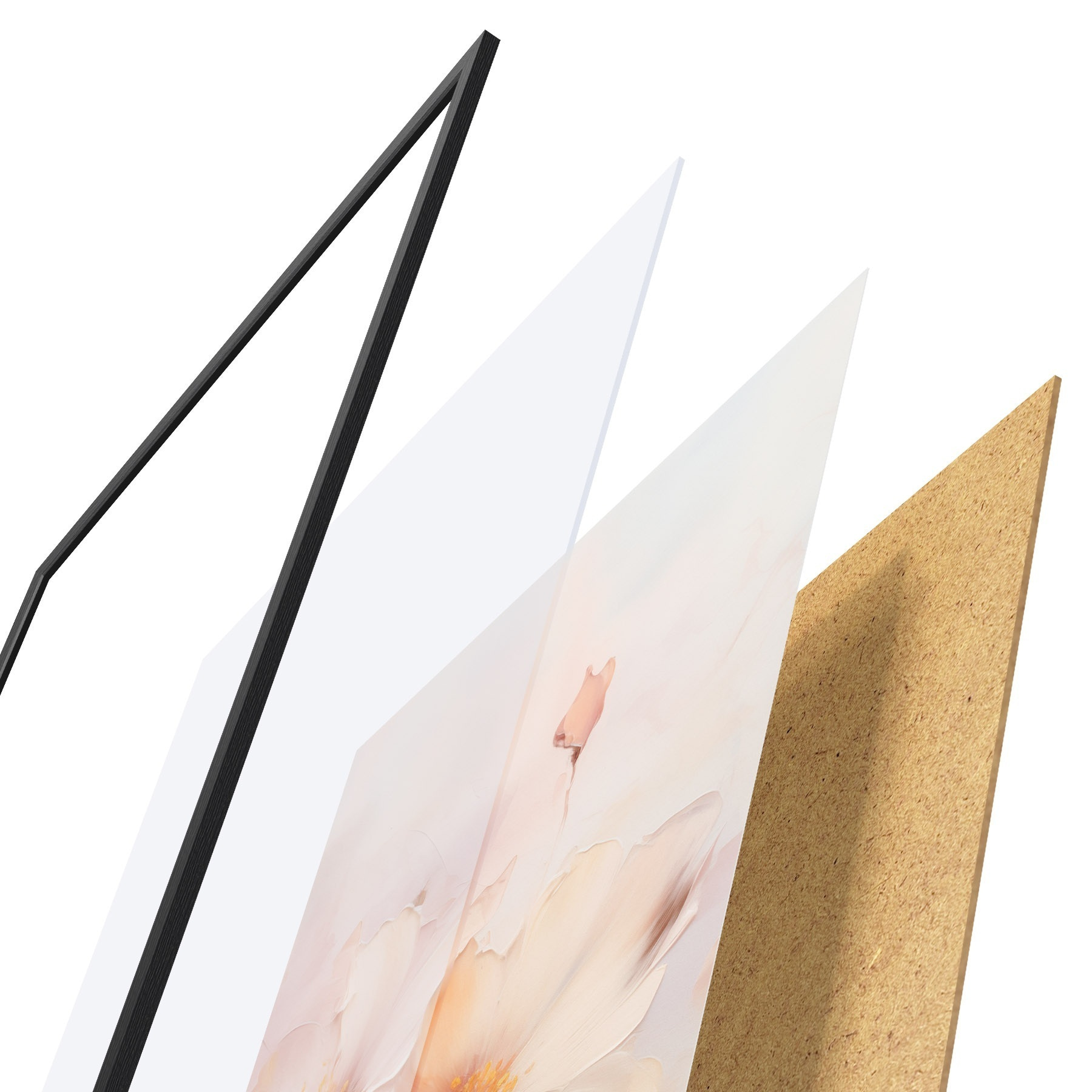 El póster consta de marco, plexiglás, imagen impresa y soporte de aglomerado. El póster puede colgarse inmediatamente en la pared gracias a los soportes de la parte posterior.