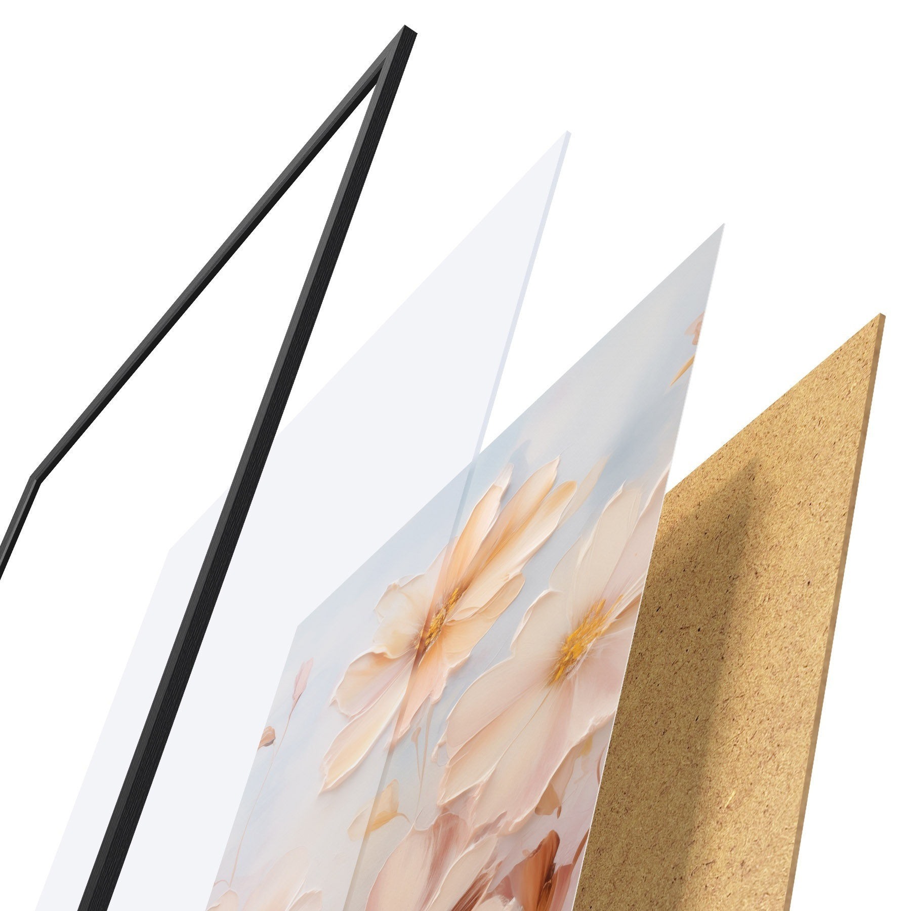 El póster consta de marco, plexiglás, imagen impresa y soporte de aglomerado. El póster puede colgarse inmediatamente en la pared gracias a los soportes de la parte posterior.