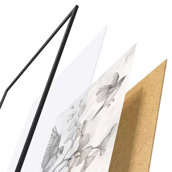 El póster consta de marco, plexiglás, imagen impresa y soporte de aglomerado. El póster puede colgarse inmediatamente en la pared gracias a los soportes de la parte posterior.