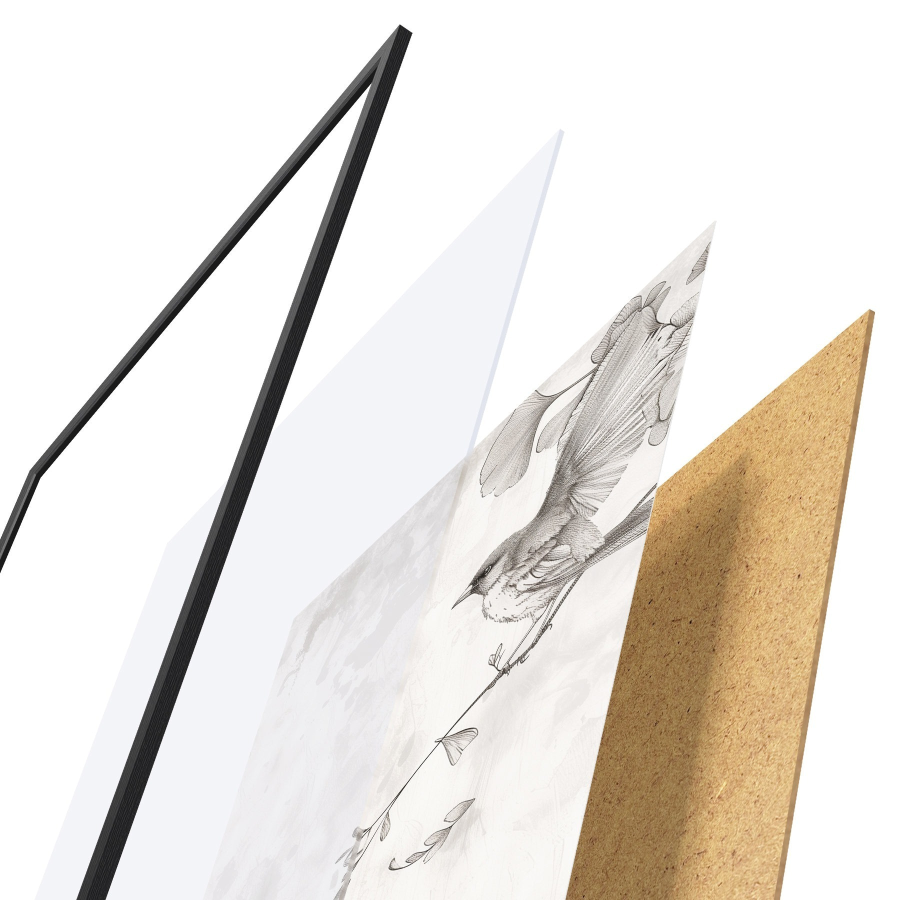 El póster consta de marco, plexiglás, imagen impresa y soporte de aglomerado. El póster puede colgarse inmediatamente en la pared gracias a los soportes de la parte posterior.