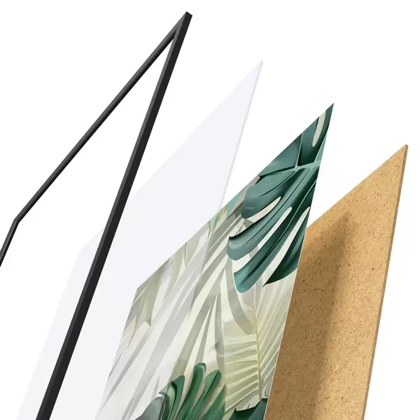 El póster consta de marco, plexiglás, imagen impresa y soporte de aglomerado. El póster puede colgarse inmediatamente en la pared gracias a los soportes de la parte posterior.