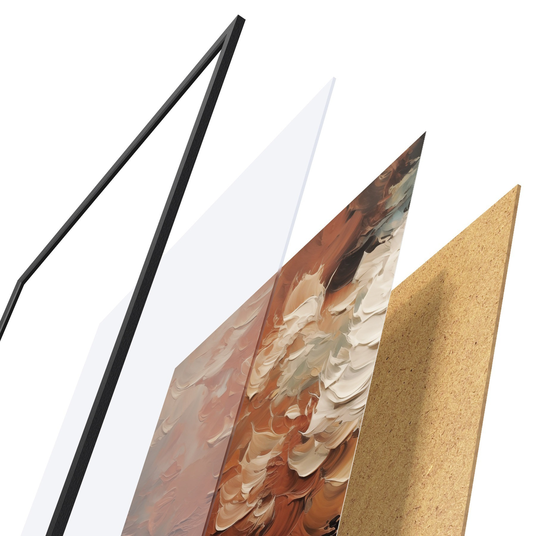 El póster consta de marco, plexiglás, imagen impresa y soporte de aglomerado. El póster puede colgarse inmediatamente en la pared gracias a los soportes de la parte posterior.