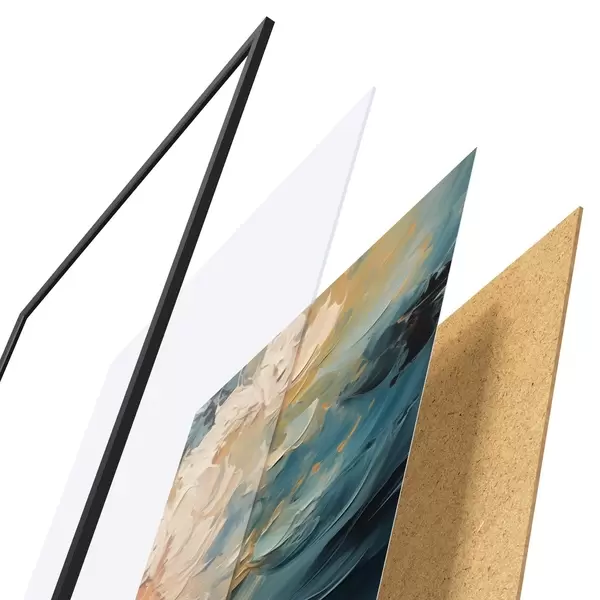 El póster consta de marco, plexiglás, imagen impresa y soporte de aglomerado. El póster puede colgarse inmediatamente en la pared gracias a los soportes de la parte posterior.