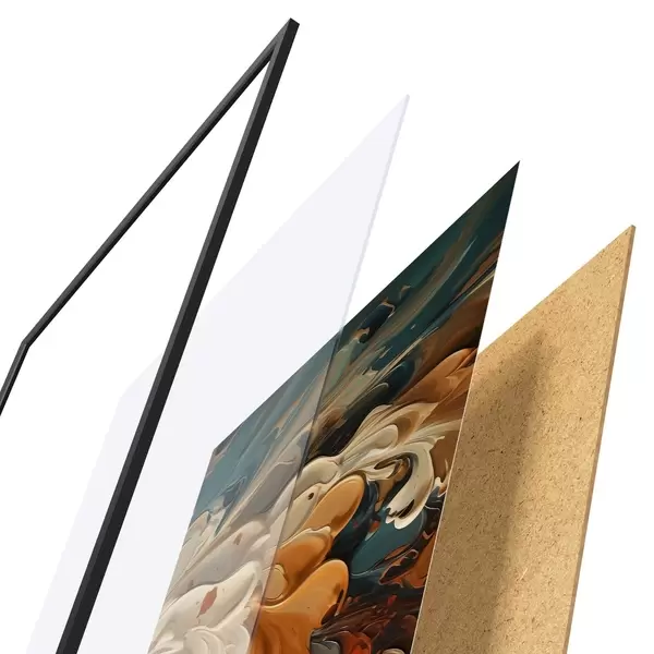 El póster consta de marco, plexiglás, imagen impresa y soporte de aglomerado. El póster puede colgarse inmediatamente en la pared gracias a los soportes de la parte posterior.