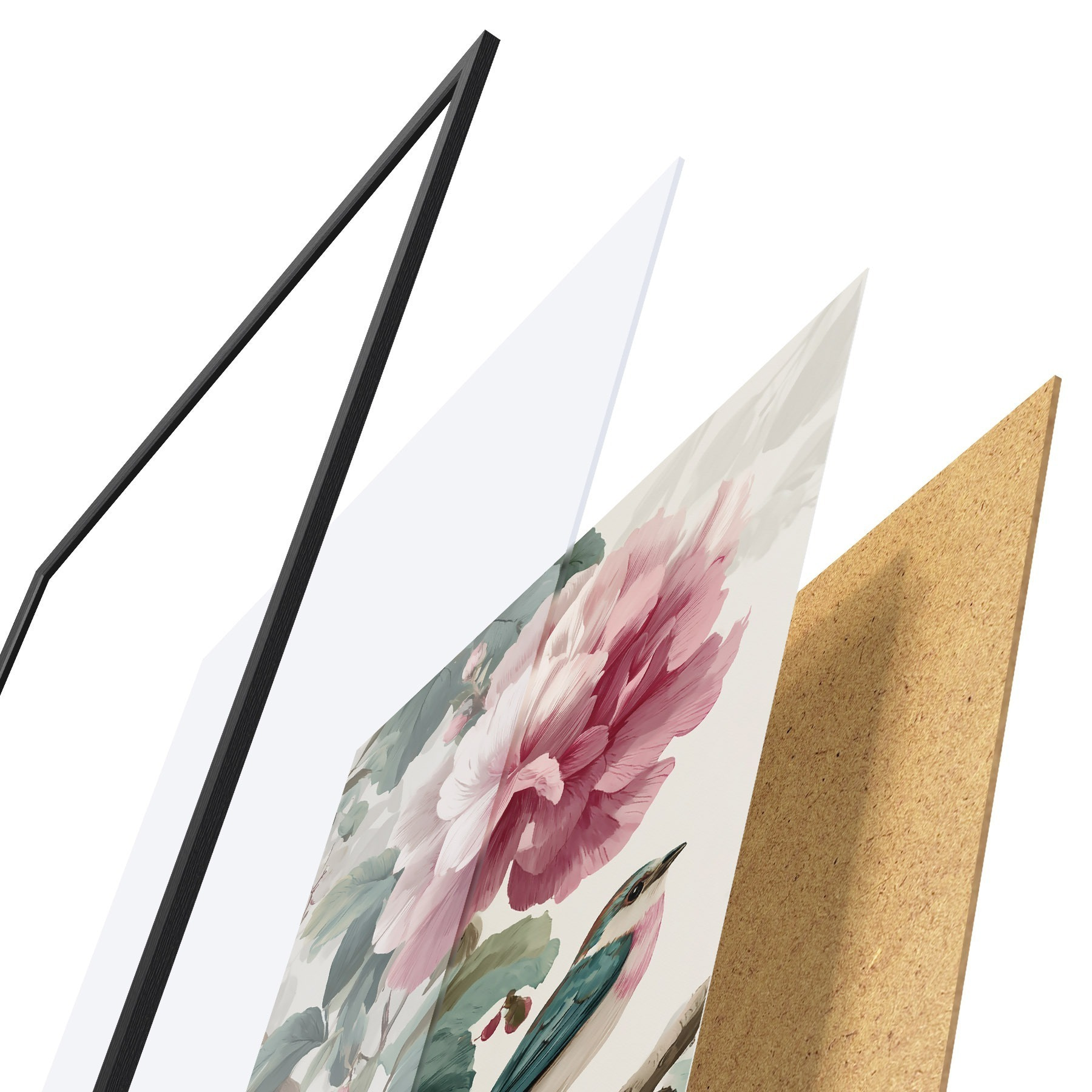 El póster consta de marco, plexiglás, imagen impresa y soporte de aglomerado. El póster puede colgarse inmediatamente en la pared gracias a los soportes de la parte posterior.