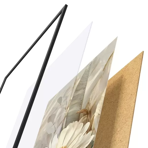 El póster consta de marco, plexiglás, imagen impresa y soporte de aglomerado. El póster puede colgarse inmediatamente en la pared gracias a los soportes de la parte posterior.