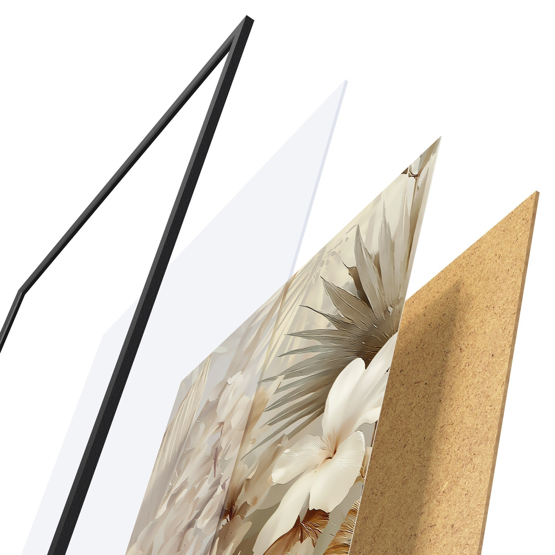 El póster consta de marco, plexiglás, imagen impresa y soporte de aglomerado. El póster puede colgarse inmediatamente en la pared gracias a los soportes de la parte posterior.