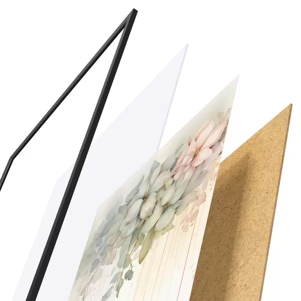 El póster consta de marco, plexiglás, imagen impresa y soporte de aglomerado. El póster puede colgarse inmediatamente en la pared gracias a los soportes de la parte posterior.