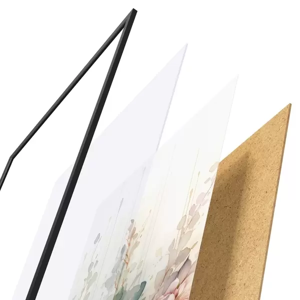 El póster consta de marco, plexiglás, imagen impresa y soporte de aglomerado. El póster puede colgarse inmediatamente en la pared gracias a los soportes de la parte posterior.