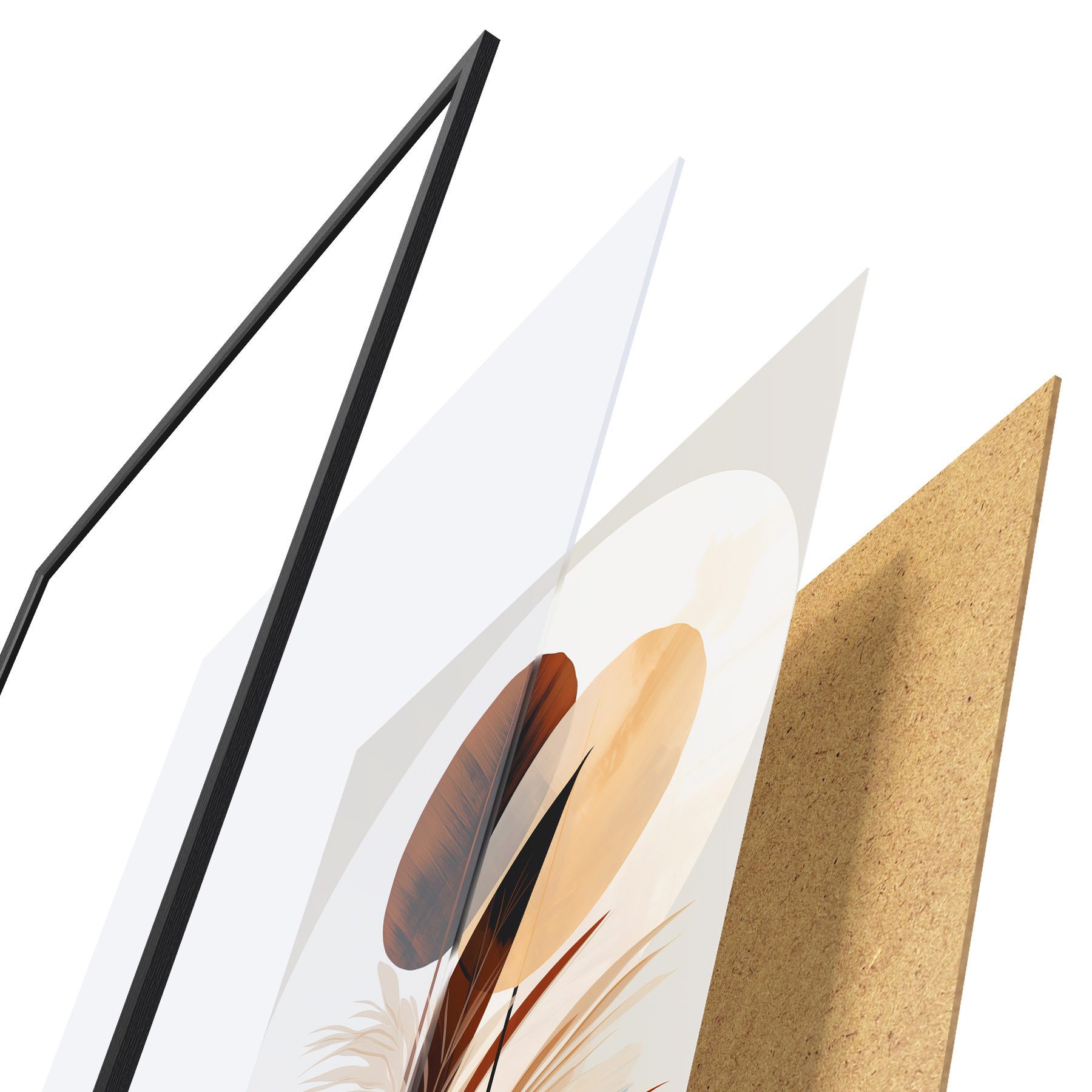 El póster consta de marco, plexiglás, imagen impresa y soporte de aglomerado. El póster puede colgarse inmediatamente en la pared gracias a los soportes de la parte posterior.