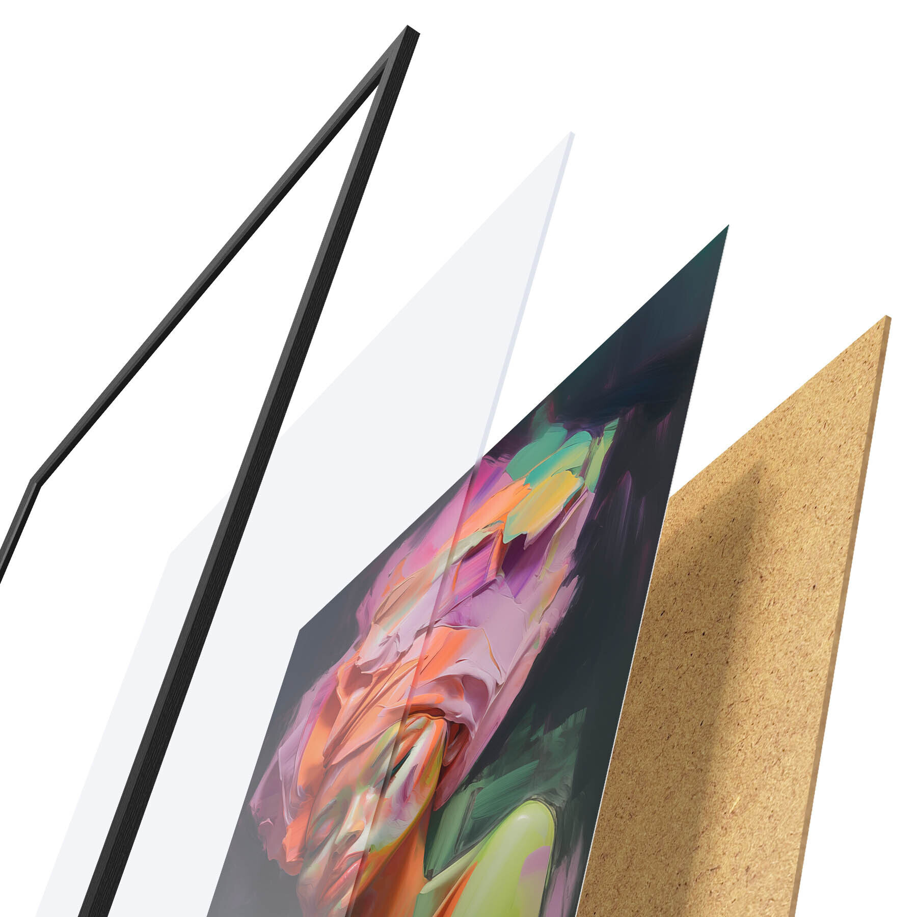 El póster consta de marco, plexiglás, imagen impresa y soporte de aglomerado. El póster puede colgarse inmediatamente en la pared gracias a los soportes de la parte posterior.