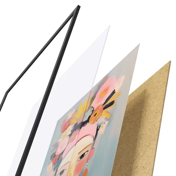 El póster consta de marco, plexiglás, imagen impresa y soporte de aglomerado. El póster puede colgarse inmediatamente en la pared gracias a los soportes de la parte posterior.