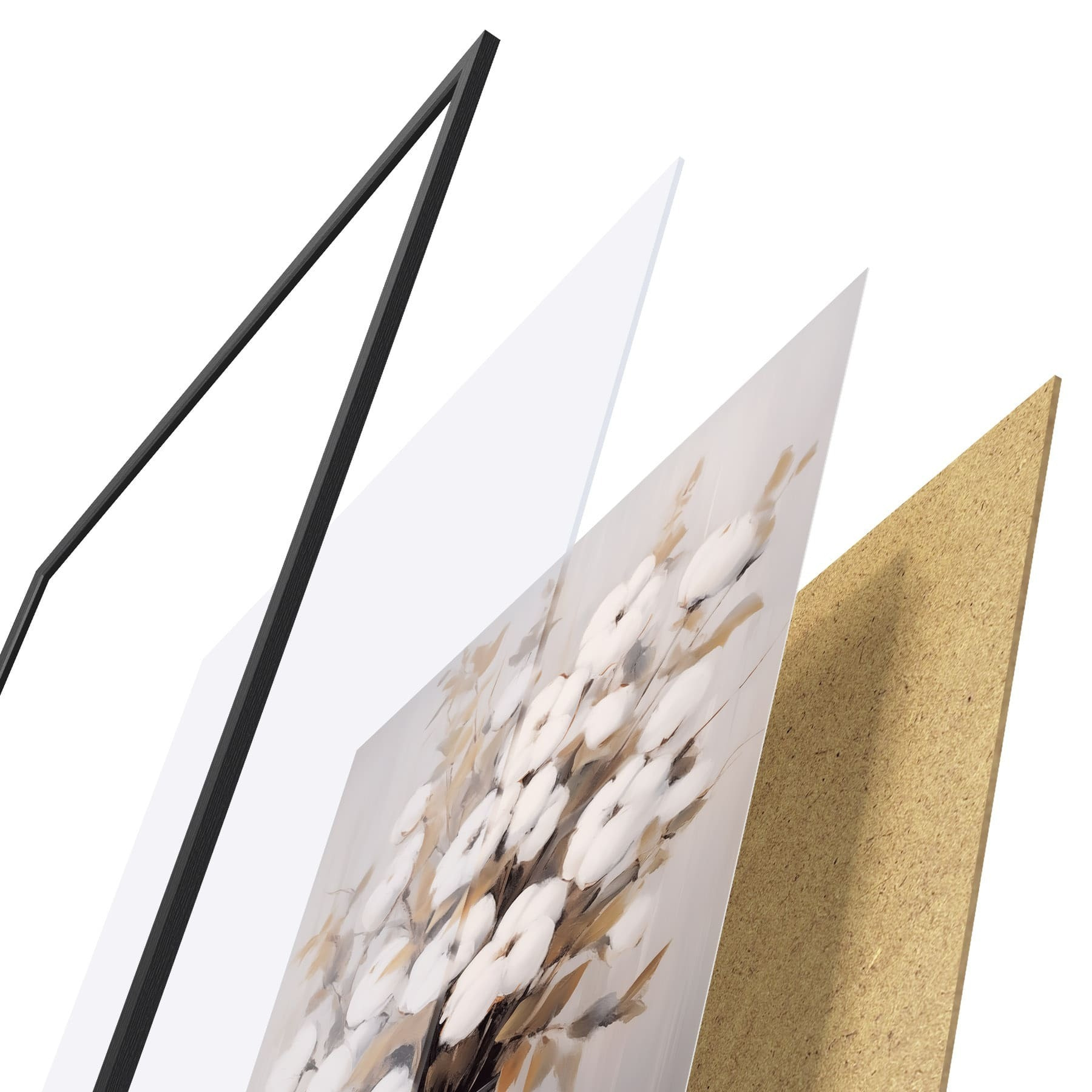 El póster consta de marco, plexiglás, imagen impresa y soporte de aglomerado. El póster puede colgarse inmediatamente en la pared gracias a los soportes de la parte posterior.