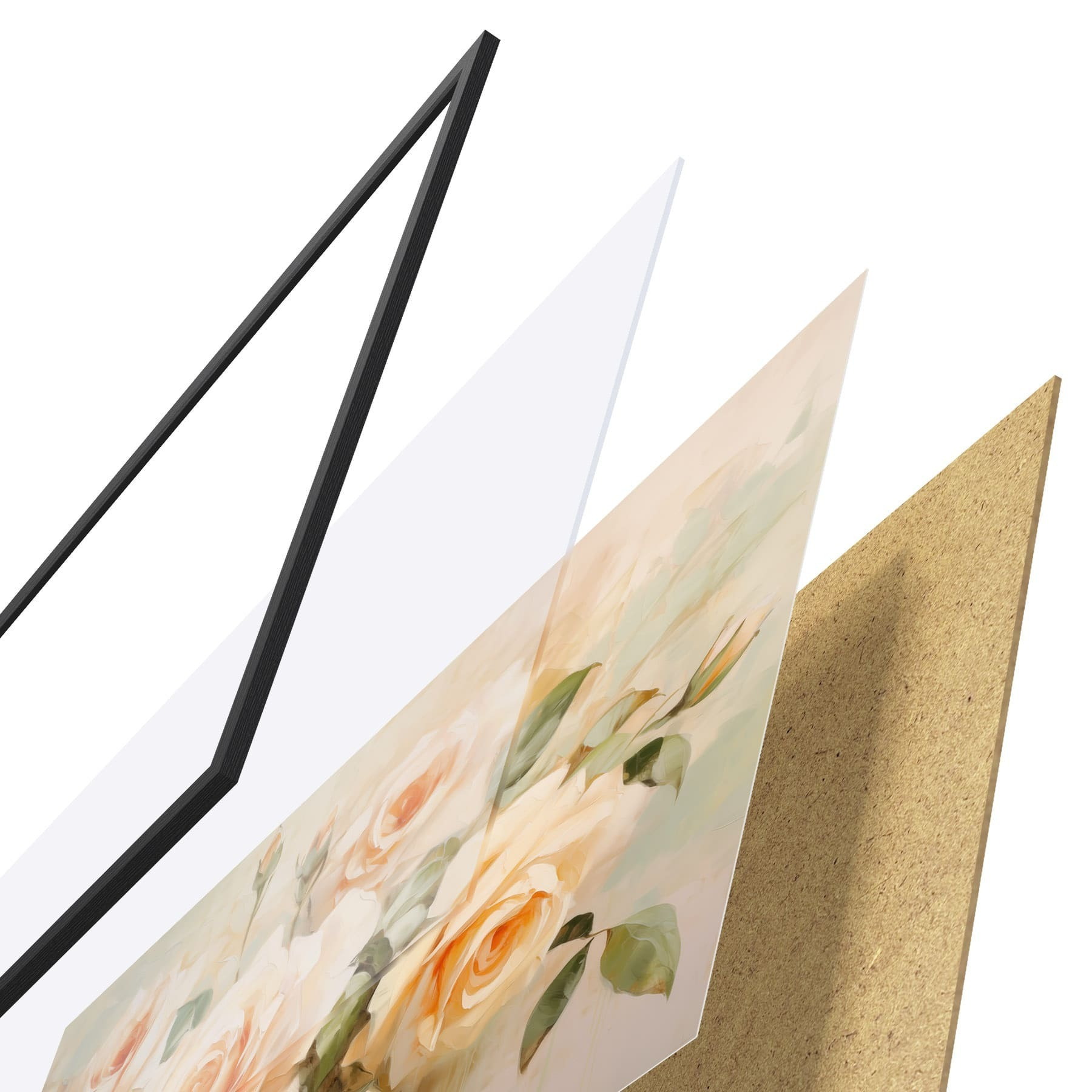 El póster consta de marco, plexiglás, imagen impresa y soporte de aglomerado. El póster puede colgarse inmediatamente en la pared gracias a los soportes de la parte posterior.