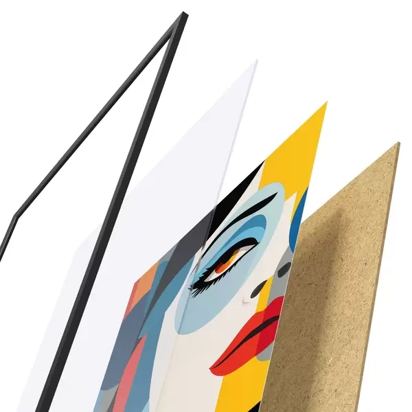 El póster consta de marco, plexiglás, imagen impresa y soporte de aglomerado. El póster puede colgarse inmediatamente en la pared gracias a los soportes de la parte posterior.