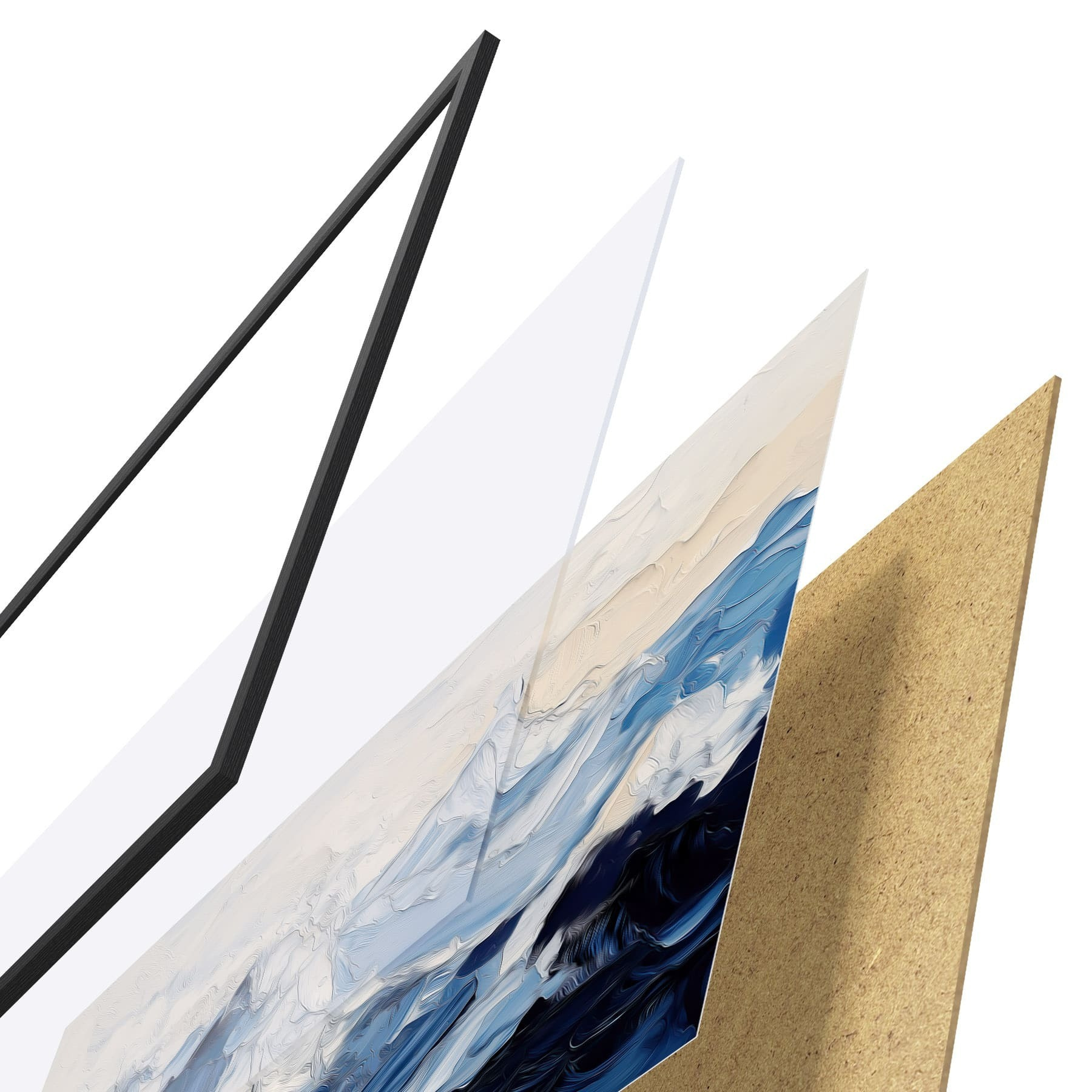 El póster consta de marco, plexiglás, imagen impresa y soporte de aglomerado. El póster puede colgarse inmediatamente en la pared gracias a los soportes de la parte posterior.