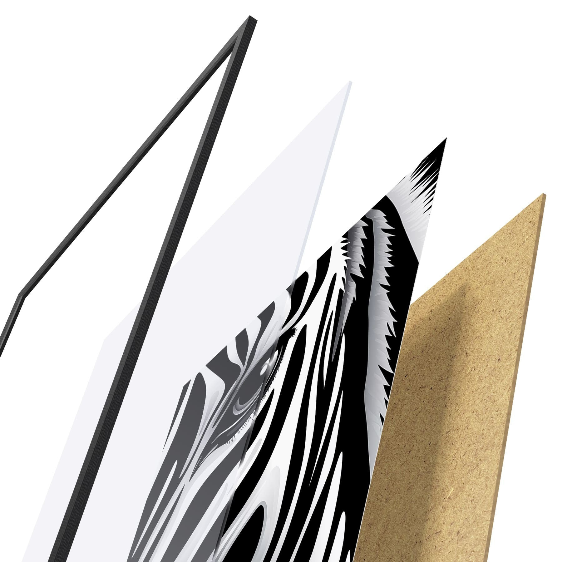 El póster consta de marco, plexiglás, imagen impresa y soporte de aglomerado. El póster puede colgarse inmediatamente en la pared gracias a los soportes de la parte posterior.