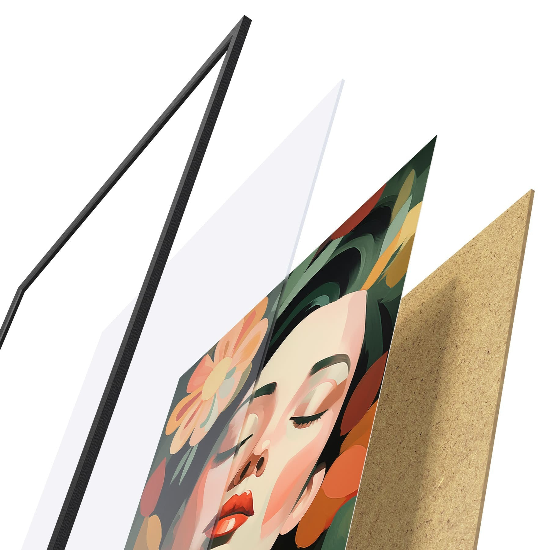 El póster consta de marco, plexiglás, imagen impresa y soporte de aglomerado. El póster puede colgarse inmediatamente en la pared gracias a los soportes de la parte posterior.