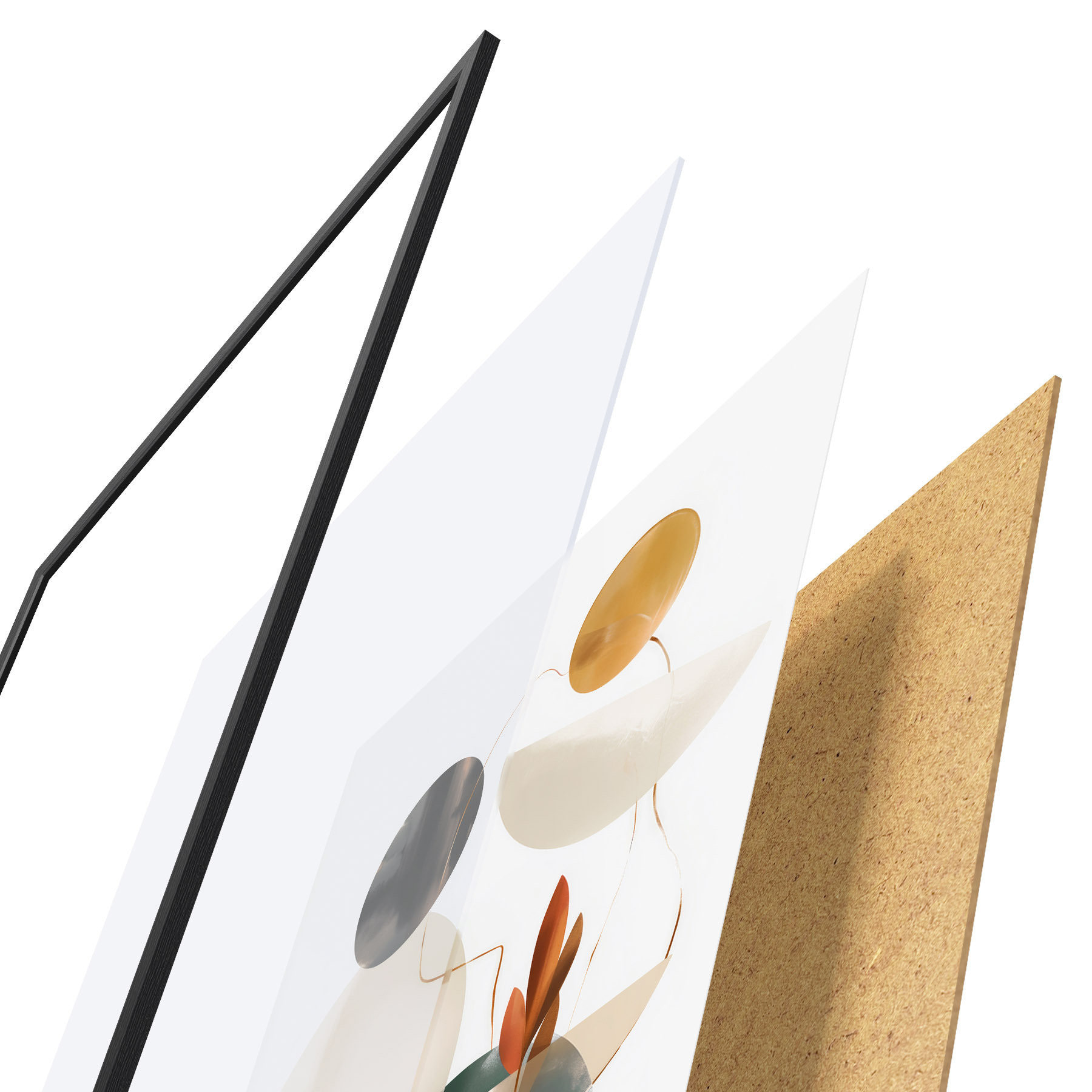 El póster consta de marco, plexiglás, imagen impresa y soporte de aglomerado. El póster puede colgarse inmediatamente en la pared gracias a los soportes de la parte posterior.