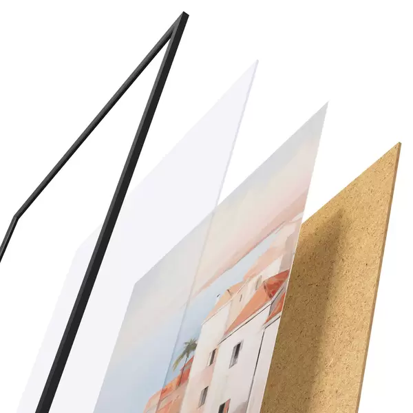 El póster consta de marco, plexiglás, imagen impresa y soporte de aglomerado. El póster puede colgarse inmediatamente en la pared gracias a los soportes de la parte posterior.