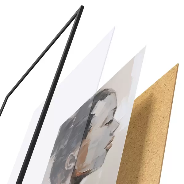 El póster consta de marco, plexiglás, imagen impresa y soporte de aglomerado. El póster puede colgarse inmediatamente en la pared gracias a los soportes de la parte posterior.