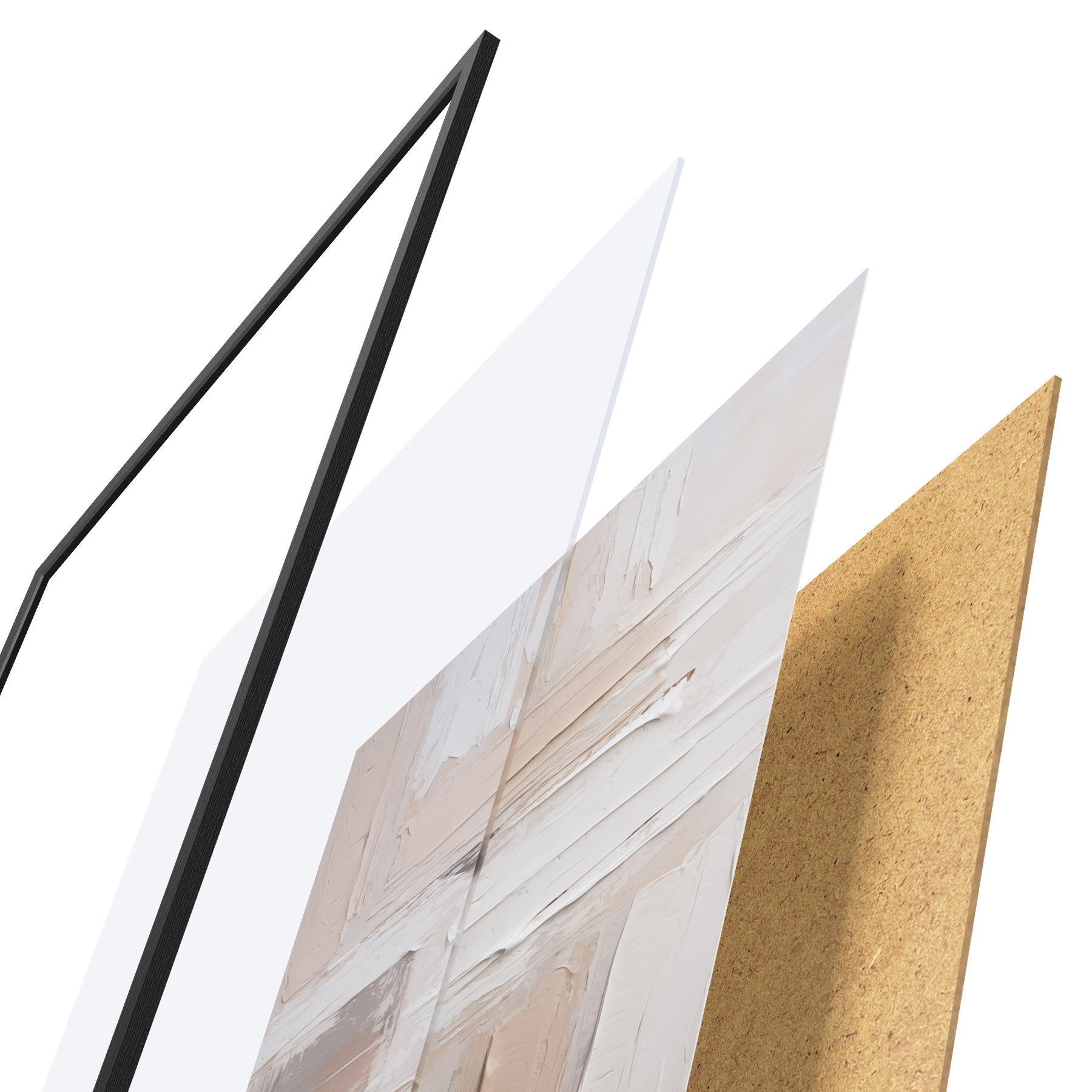 El póster consta de marco, plexiglás, imagen impresa y soporte de aglomerado. El póster puede colgarse inmediatamente en la pared gracias a los soportes de la parte posterior.