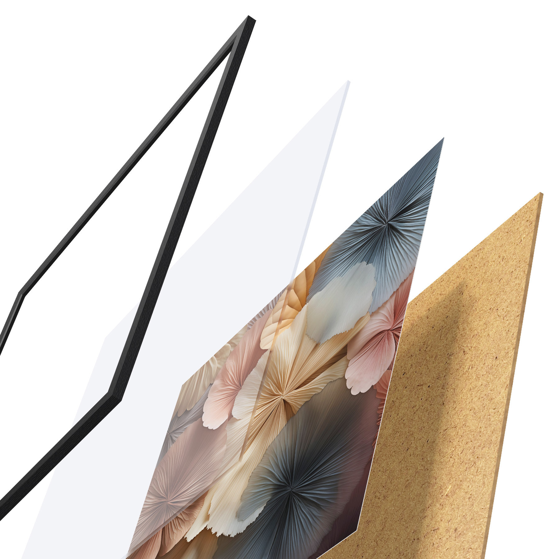 El póster consta de marco, plexiglás, imagen impresa y soporte de aglomerado. El póster puede colgarse inmediatamente en la pared gracias a los soportes de la parte posterior.