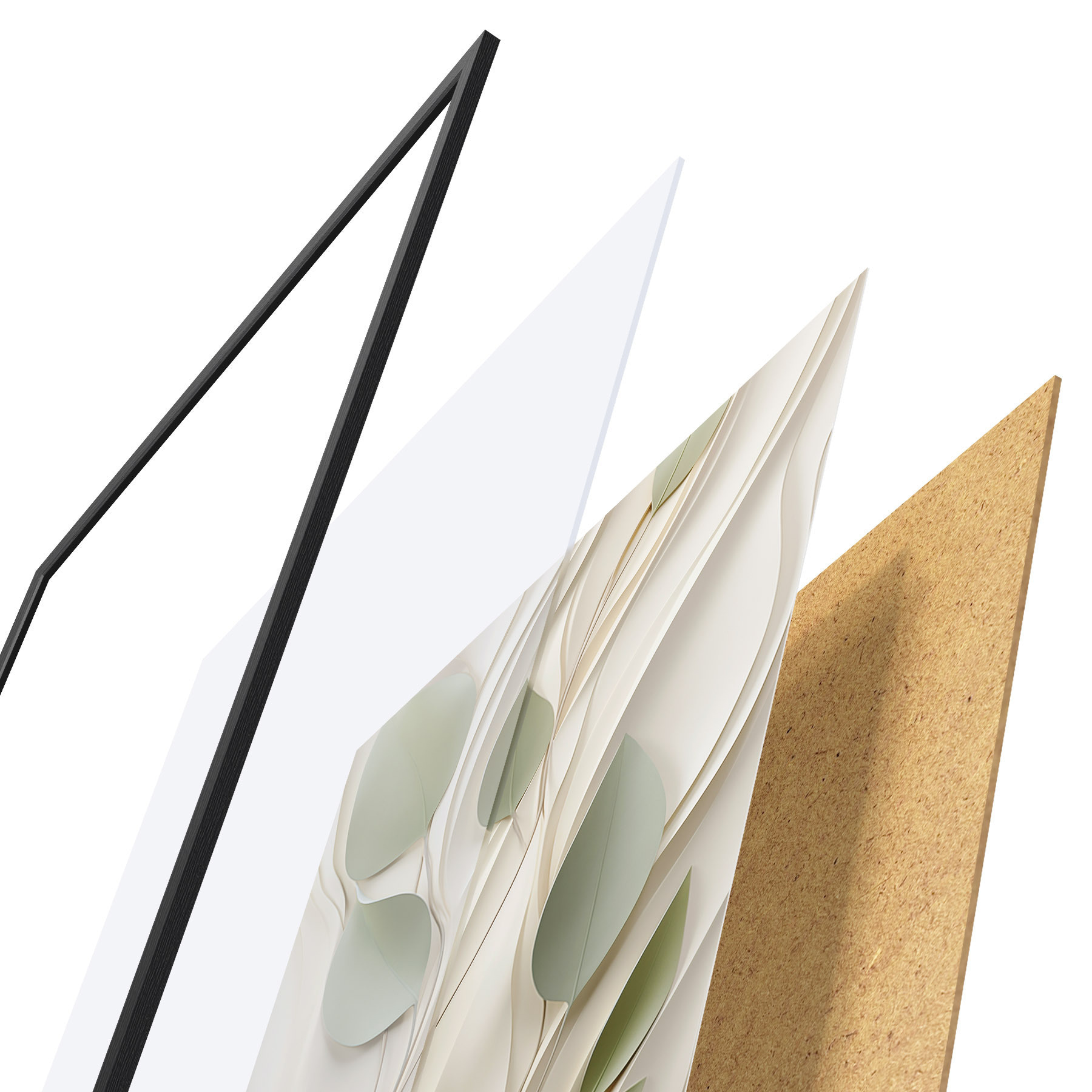 El póster consta de marco, plexiglás, imagen impresa y soporte de aglomerado. El póster puede colgarse inmediatamente en la pared gracias a los soportes de la parte posterior.