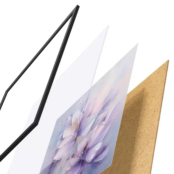 El póster consta de marco, plexiglás, imagen impresa y soporte de aglomerado. El póster puede colgarse inmediatamente en la pared gracias a los soportes de la parte posterior.