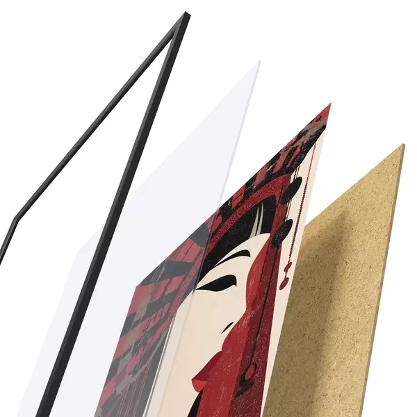 El póster consta de marco, plexiglás, imagen impresa y soporte de aglomerado. El póster puede colgarse inmediatamente en la pared gracias a los soportes de la parte posterior.