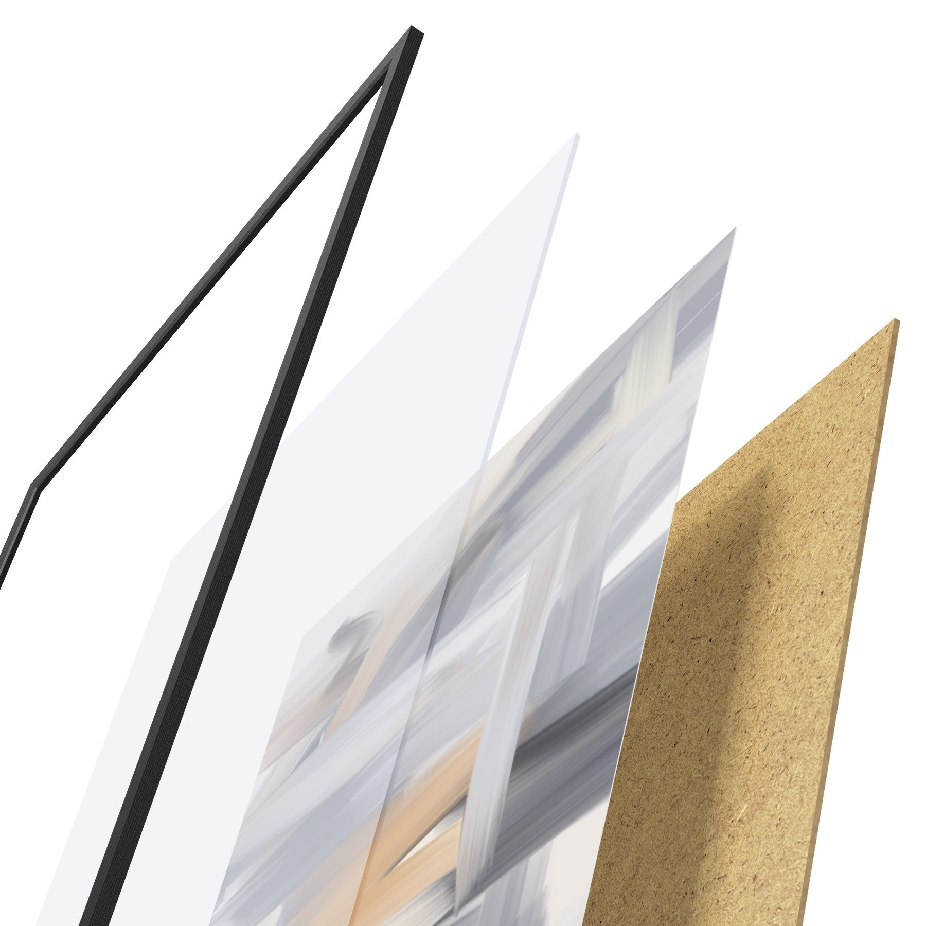 El póster consta de marco, plexiglás, imagen impresa y soporte de aglomerado. El póster puede colgarse inmediatamente en la pared gracias a los soportes de la parte posterior.
