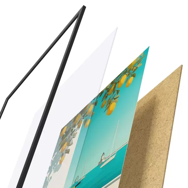El póster consta de marco, plexiglás, imagen impresa y soporte de aglomerado. El póster puede colgarse inmediatamente en la pared gracias a los soportes de la parte posterior.