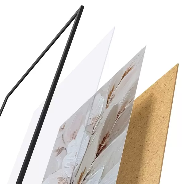 El póster consta de marco, plexiglás, imagen impresa y soporte de aglomerado. El póster puede colgarse inmediatamente en la pared gracias a los soportes de la parte posterior.