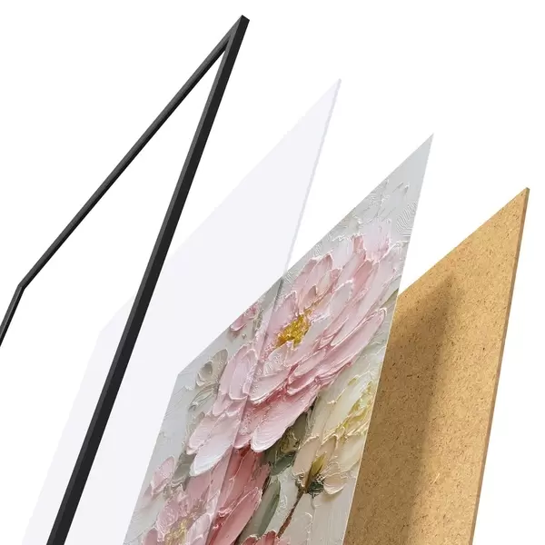 El póster consta de marco, plexiglás, imagen impresa y soporte de aglomerado. El póster puede colgarse inmediatamente en la pared gracias a los soportes de la parte posterior.
