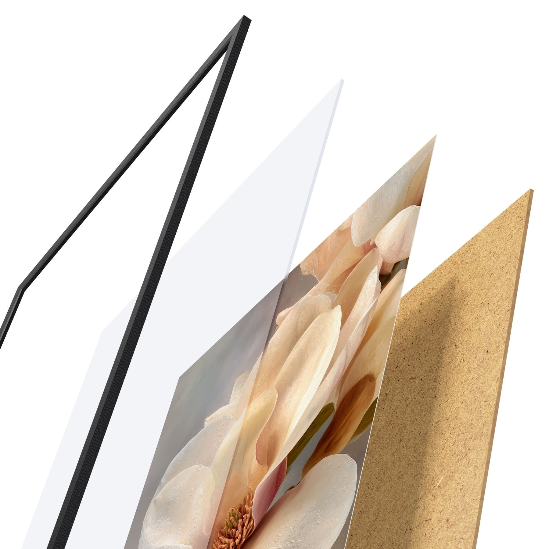 El póster consta de marco, plexiglás, imagen impresa y soporte de aglomerado. El póster puede colgarse inmediatamente en la pared gracias a los soportes de la parte posterior.